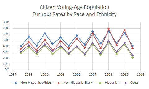 We hope that more people who have the right to vote will do so. And from a demographic perspective, we would be fascinated to learn why Asian-Americans and Hispanics lag behind other groups in registration and voting habits.